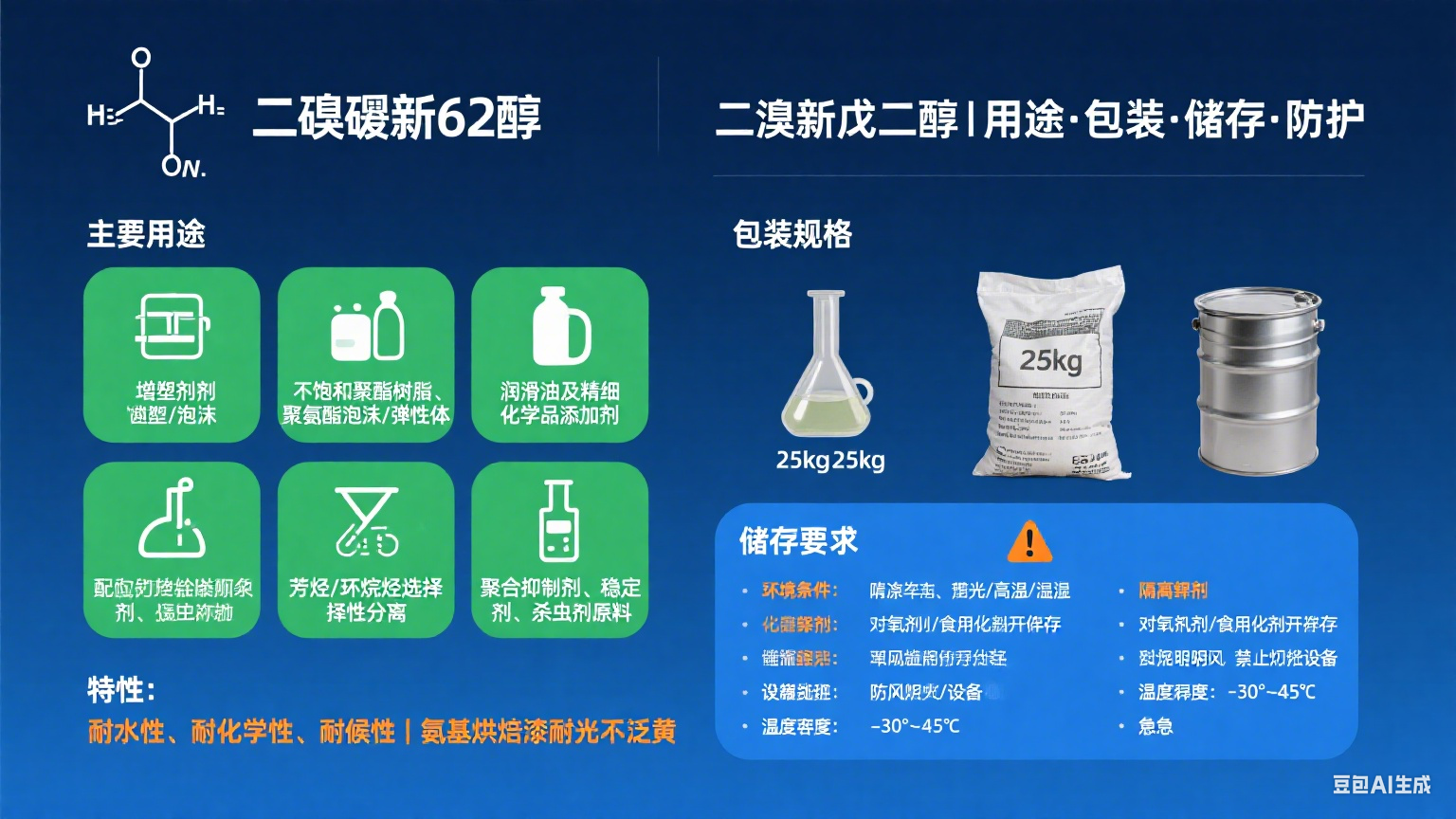 二溴新戊二醇被廣泛用作增塑劑,用于生產(chǎn)不飽和聚酯樹脂、無油醇酸樹脂、聚氨酯泡沫和彈性體,是良好潤滑油和其他精細(xì)化學(xué)品的添加劑。新戊二醇是一種優(yōu)良的溶劑,可用于芳烴和環(huán)烷烴的選擇性分離。新戊二醇具有耐水性、耐化學(xué)性和耐候性。氨基烘焙漆具有良好的耐光性,不會(huì)變黃。它也可以用作生產(chǎn)聚合抑制劑、穩(wěn)定劑和殺蟲劑的原料。